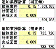 追加業務計算 補正値 ■ 追加業務 −積算・他− 右側の表は、追加業務業務時間の係数を記入したものです。 |